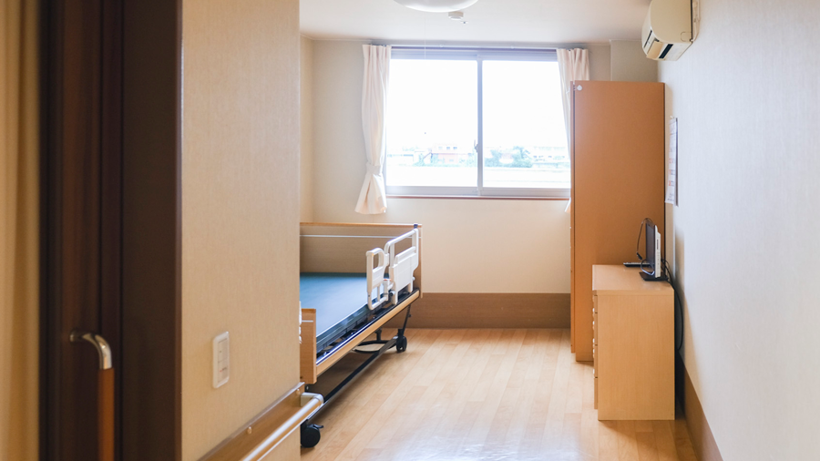 全室個室(18.0㎡) ナースコール、トイレ、洗面台、介護用ベッド、クローゼット、テレビおよチェスト(引き出し付き)